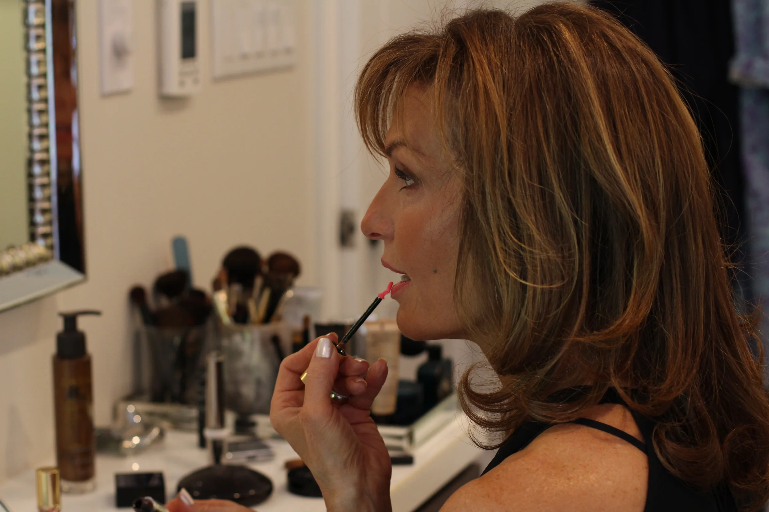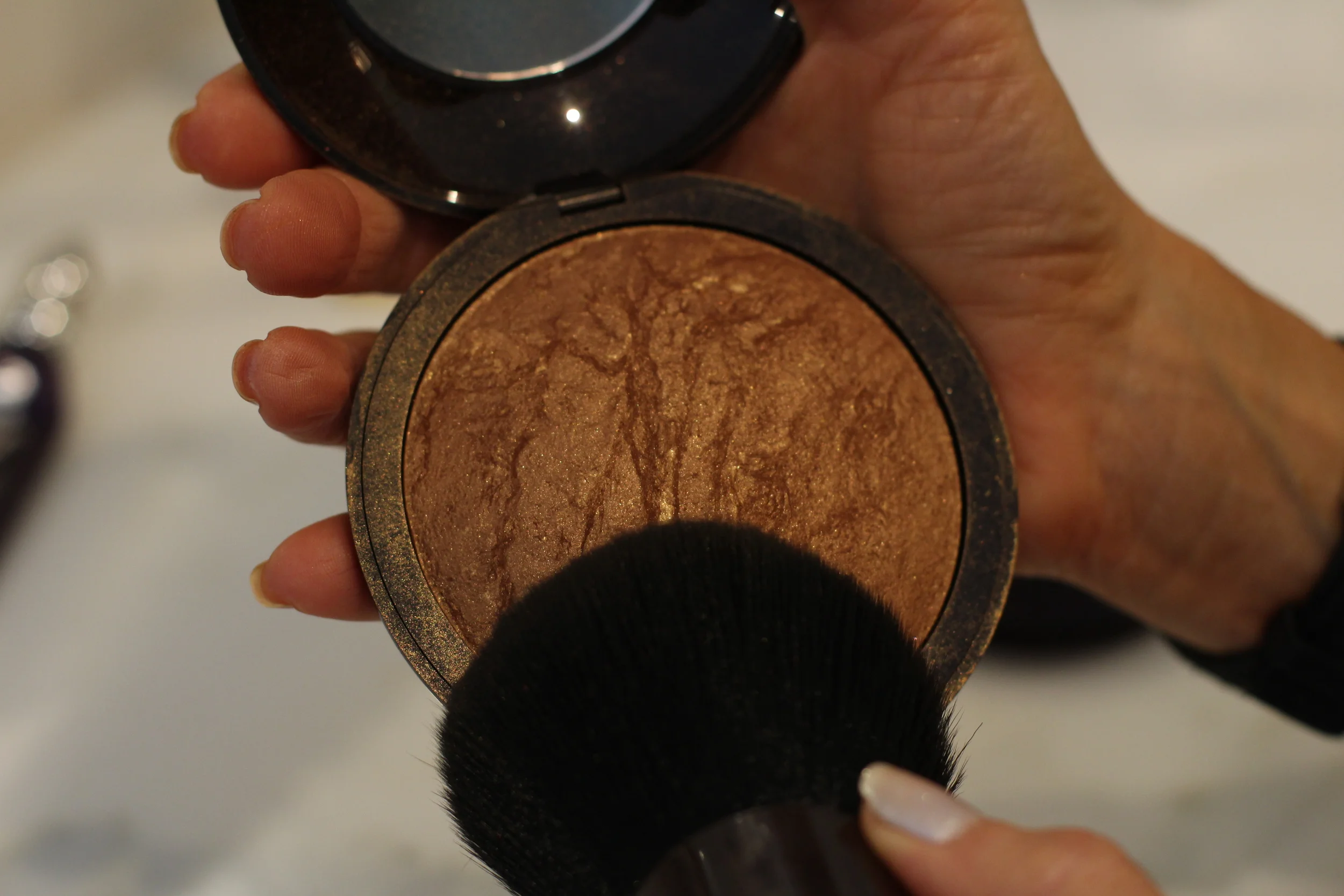 /Urban Decay Eyeshadow Primer Potion, La Prairie Anti Aging Hydra Tint with 20 SPF, Guerlain Healthy Glow (Terracotta Skin line) Foundation, Daniel Thompson’s Rendezvous, Givenchy’s Le Prism Quad #76, La Prairie’s Smokey Quartz, La Prairie Light Fantastic Concealer, Guerlain’s Terracotta Bronzing Powder, NARS The Multiple, Laura Mercier’s Radiance Baked Body Bronzer, Caudalie’s Divine Leg, YSL Rouge Volupte Shine #16, YSL Gloss Volupte #3.