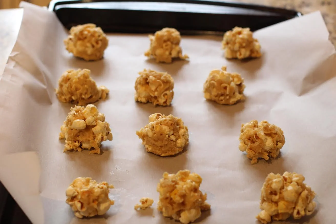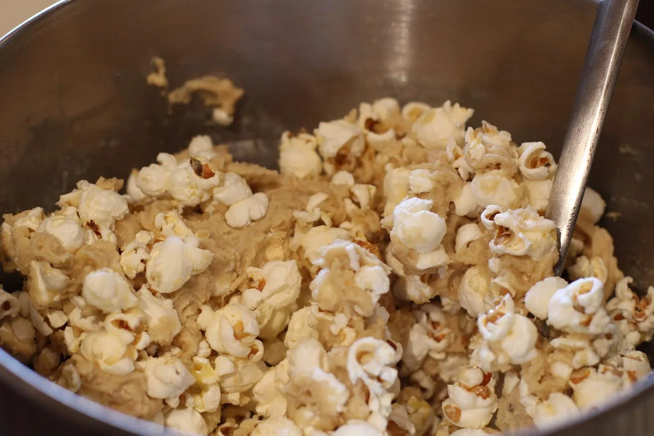 Preheat the oven to 350 degrees. In a large bowl, cream together the softened butter, brown sugar, granulated sugar, egg, and vanilla until smooth. In a separate bowl, whisk the flour and baking soda together. Stir the combined dry ingredients into the butter- sugar mixture. Fold in the cooled popcorn so that it is evenly distributed through the batter, which will seem like a ridiculous instruction because there is so much popcorn and so little batter, but it works.