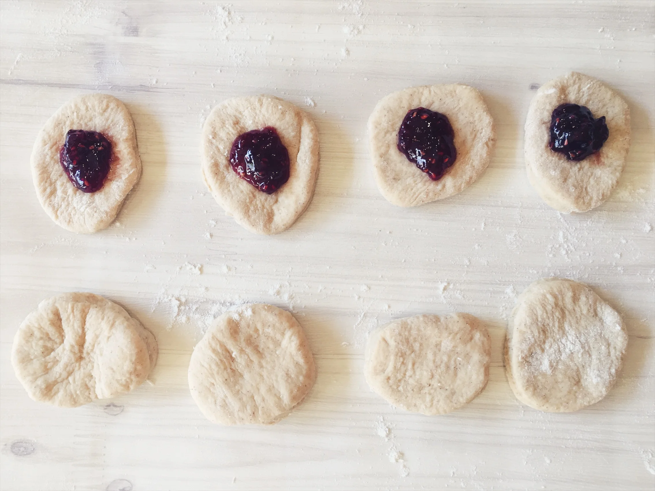 4. Roll out the dough to a thickness of 1/8" inch. Cut out the dough into 24 rounds with a juice glass. Take 1/2 tsp of preserves and place in the center of 12 of the rounds. Top with the other 12 rounds. Press down at edges, sealing with egg whites. Crimping with the thumb and second finger is best. Let rise for about 30 minutes.